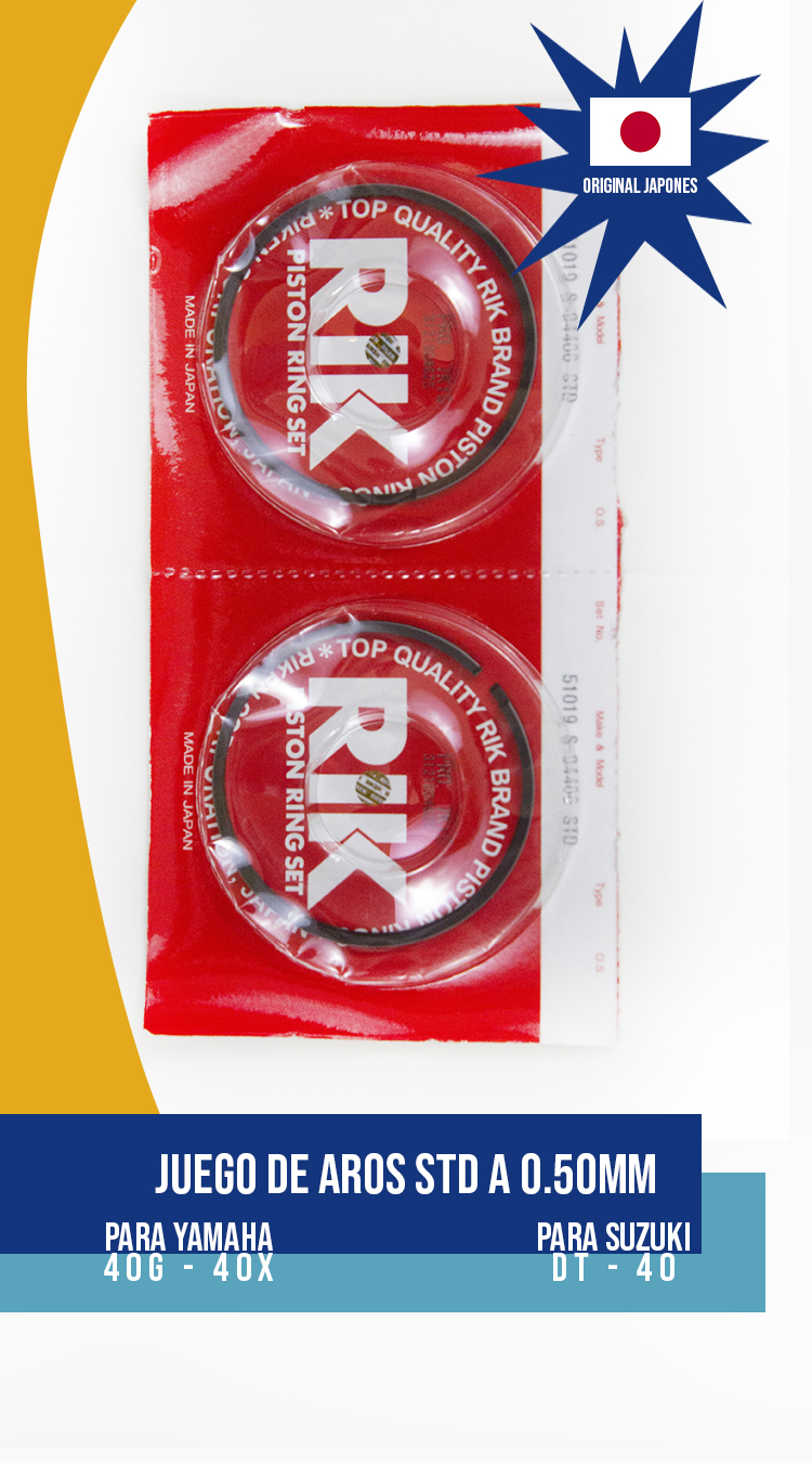 Inicio / Suzuki / Aros STD a 0.50mm para Yamaha 40G/40X y Suzuki DT-40 Aros STD a 0.50mm para Yamaha 40G/40X y Suzuki DT-40 Categorías: Suzuki, Yamaha Información adicional Información adicional Marca RIK Productos relacionados Suzuki Piñón de ataque para Suzuki DT-40 Yamaha Piñón o Corona marcha adelante para Yamaha 40G Yamaha Pistón STD a 0.5mm para Yamaha 40G/40X Yamaha Camisa de cilindro STD para Yamaha 40G/40X y Suzuki DT-40